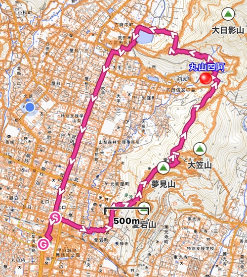 10時半に甲府駅北口のファミリーマートに集合し、愛宕山を目指してスタート。英和高校の脇から愛宕山への歩道を歩く。途中、意外と急な勾配の所があってチョット驚いた。 愛宕山こどもの国で一休みしながら、フラフープで遊んだ。子供の頃にやったきりで超久し振りだったが何とか回すことができた。 夢見山の脇の遊歩道を通って変形自転車広場へ出た。休園のため入口の門が閉まっていたが、門扉を乗り越えて道路へ出た。 愛宕山スカイラインを北進し樹木見本園の手前の丸山遊歩道へ入り、頂上の四阿で昼食休憩。 食後、樹木見本園の脇の山道を登って、躑躅ヶ崎園地で一休みして、若宮八幡神社~竜華池~武田神社~甲府駅南口まで歩いた。 いつもの四文屋で5時少し前まで楽しく打ち上げて今年の山歩納めを終了し、また来年も楽しく山歩することを誓って帰途に就いた。 山歩時間:3時間44分 距離:8.5km
